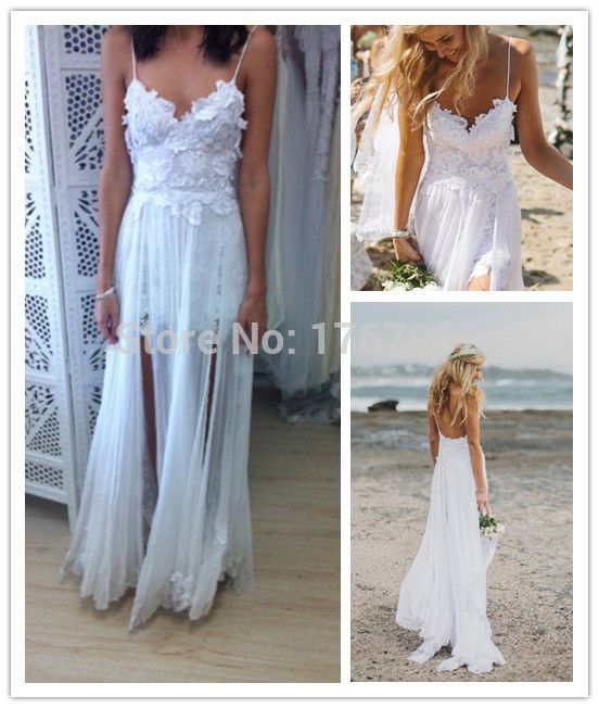 Sexy White Spaghetti Strap Lace Chiffon Summer Beach Wedding Dresses Bridal Gown With Low Back Zipper From Queenparty