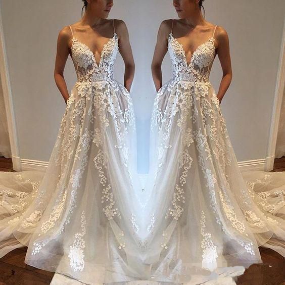 Lace Plunge V Spaghetti Straps Floor Length A Line Wedding Dress Featuring Open Back Beach Wedding Dress Boho Wedding Dress