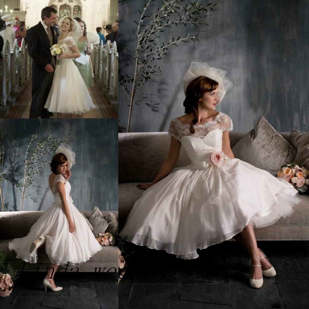 Free Shipping Tea Length Low Back Short Vintage Wedding Dress New Lace Chiffon Bridal Gown Women Dress