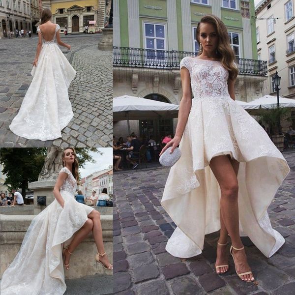 Discount Stylish High Low Backless Wedding Dresses With Cap Sleeves A Line Bateau Neck Tulle Lace Appliqued Short Bridal Gowns Best Dresses Online