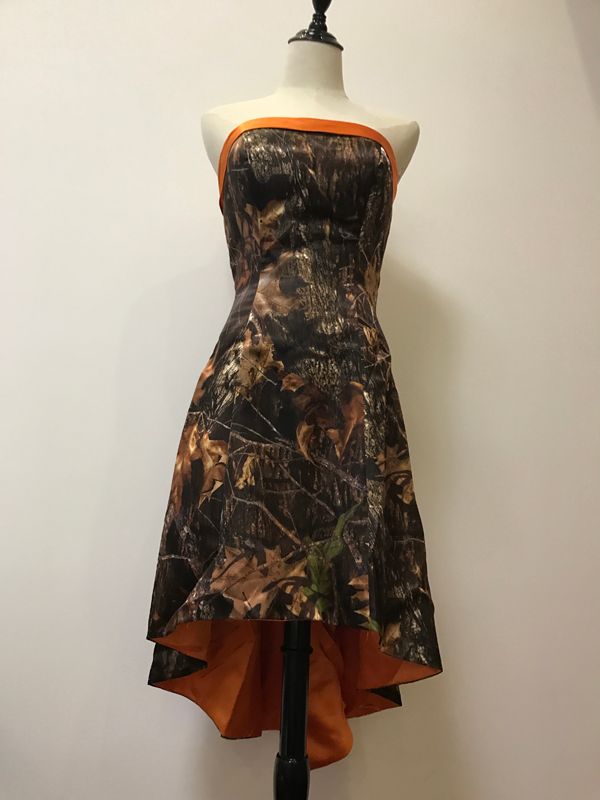 Mossy Oak Camo Strapless Hi Lo Orange Camouflage Bridesmaid Dress Corset Back