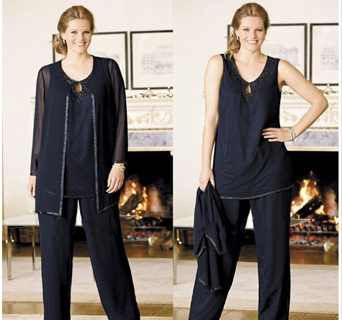 Navy Blue Mother Of The Bride Pant Suits With Jacket Beads Plus Size Wedding Guest Groom Dress Cheap Mothers Outfit Long Garment