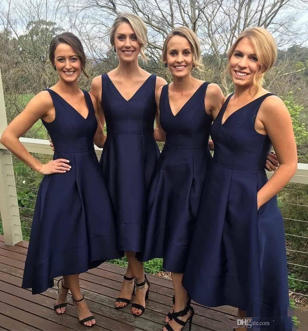 2018 Bridesmaid Dresses V Neck Sleeveless Navy Blue Hi Lo Length Wedding Guest Wear Party Plus Size Maid Of Honor Gowns With Pocket Cocktail Dress