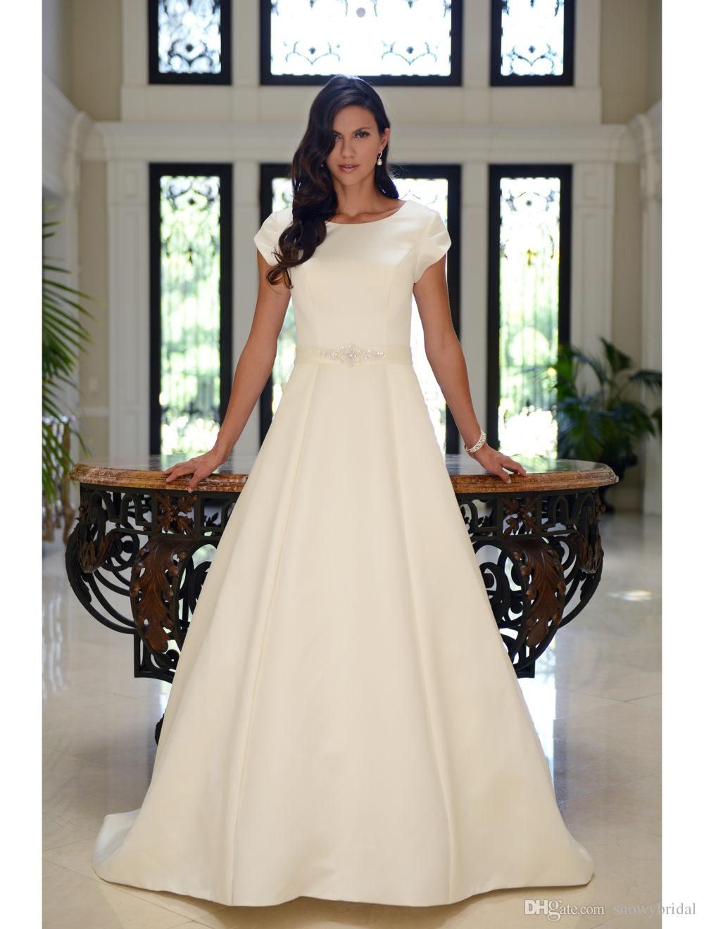 Simple Satin A Line Modest Wedding Dresses With Sleeves Beaded Belt Buttons Back Vintage Bridal Gowns Custom Made Lds Wedding Gown Sale