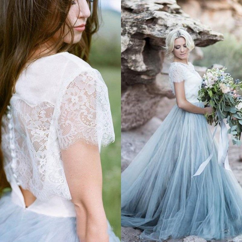 2017 Two Pieces Country Wedding Dresses Beach Bohemian Lace Tulle Bridal Gowns Sheer Neck Short Sleeves Pale Blue Colored Guest Party Gowns