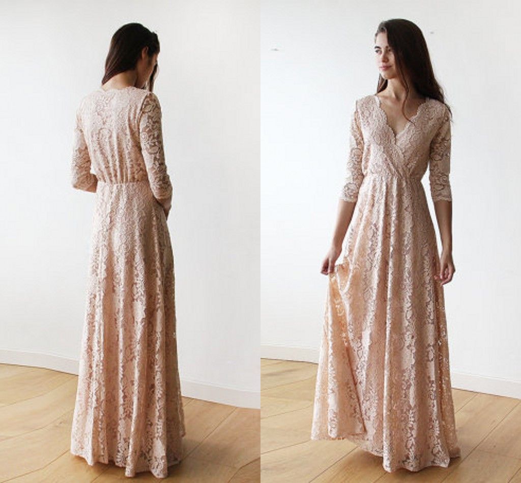 Vintage Blush Pink Lace Long Sleeve Bridesmaid Dresses 2018 Plus Size V Neck Full Length Maid Of Honor Junior Wedding Guest Dinner Gown