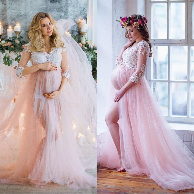 Pink A Line Wedding Dresses Maternity Pregnant Styles Bridal Gowns Sheer Long Sleeves V Neck Appliques Split Bridal Gowns Custom