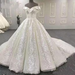 Wedding Dress Bridal Gowns Super Big Skirt Design Organza Fabric Colorful Lace Off Shoulder Chagmpagne Lace Up Back With Long Train 2019