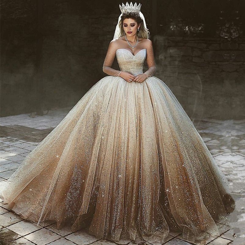 Champagne Luxurious Sweetheart Long Sleeve Wedding Dresses 2019 Bling Ball Gown Sequins Tulle Back Bandage Plus Size Bridal Gowns For Women