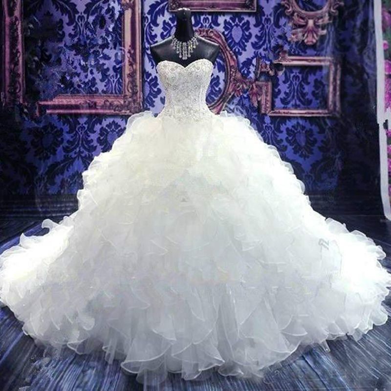 Puffy Ball Gown Ruffles Wedding Dresses Beaded Crystals Lace Up Corset Sweetheart Neckline Long Cathedral Train Custom Made Plus Size