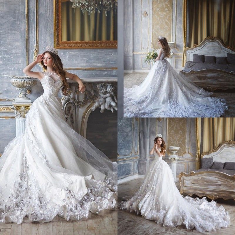 Lace Ball Gown Wedding Dresses Beaded Art Neck Monique Lhuillier Appliqued Bridal Gowns Sweep Train Long Dress For Bride